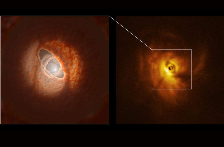 Trojhvězdný systém GW Orionis má pokroucený protoplanetární disk s prstenci hmoty různého sklonu. Na snímku vpravo, pořízeném přístrojem SPHERE, astronomové poprvé identifikovali stín, který prstenec vrhá na zbytek disku. Pomohlo jim to odhalit vzájemné prostorové uspořádání obou útvarů. Vizualizace vlevo znázorňuje vnitřní oblasti disku včetně prstence a staví na 3D rekonstrukci