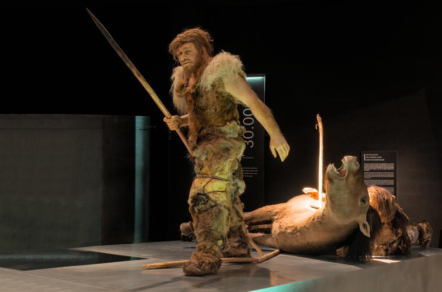Neandertálec v Gallo-románském muzeu v belgickém městě Tongeren. Časné vstávání těmto našim dávným příbuzným zřejmě usnadňovalo život během studených zim v Evropě a Asii v době ledové. (foto: Wikimedia Commons, Benoit Brummer, CC BY-SA 4.0)