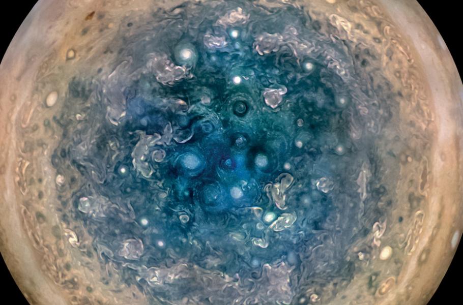 Nové fotografie planety Jupiter zachytily jeho severní a jižní pól, chaotické jevy v atmosféře a cyklóny, které dosahují velikosti Země. Nové snímky ukazují, že v okolí obou pólů se pohybují cyklóny, nad nimž se objevují působivé polární záře, které jsou až tisíckrát silnější než ty pozemské. Vědcům se také podařilo vypozorovat řadu rozdílů mezi severním a jižním pólem.