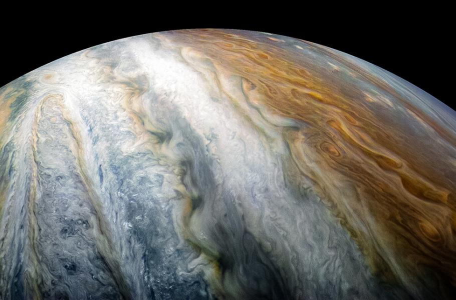 Během v pořadí již desátého průletu sondy Juno v těsné blízkosti Jupiteru, pořídila Juno tento ohromující snímek jižního pólu planety. Meziplanetární sondu v té době dělilo od svrchních vrstev atmosféry planety pouhých 13 604 kilometrů. Prostorové měřítko odpovídá 9,1 kilometru na jeden pixel. Snímek ve výřezu zachycuje jižní pól o necelou hodinu později ze vzdálenosti 104 446 kilometrů. Prostorové měřítko odpovídá 70,2 kilometrům na jeden pixel.