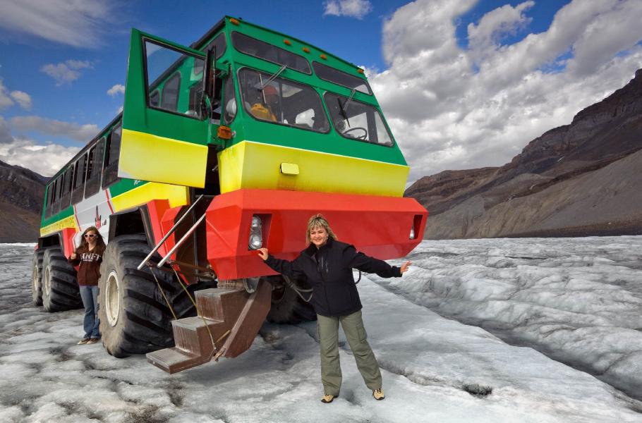 Bez váhání jsme si koupili místenky do speciálního vozidla zvaného „snowcoach“. Tyto sněžné transportéry nás rychle a bezpečně přepravily vysoko až pod úpatí ledovce Athabasca Glacier.
