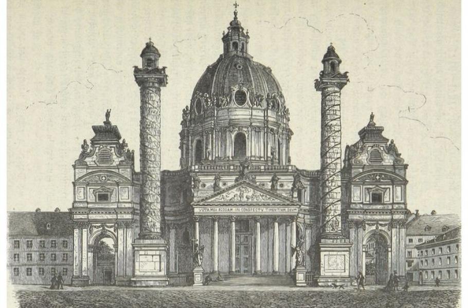 Dobová ilustrace zachycuje jednu z nejkrásnějších architektonických památek Vídně, kostel svatého Karla Boromejského, nacházející se na náměstí Karlsplatz. Ten je po Stephansdomu druhým nejvýznamnějším svatostánkem v rakouské metropoli a je také považován za druhý nejvýznamnější barokní chrám na sever od Alp.