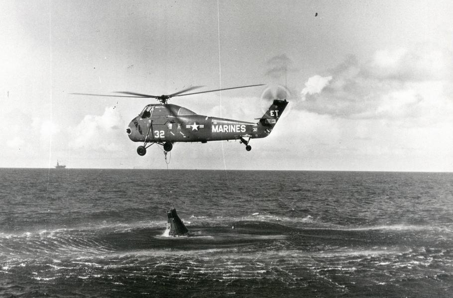 Nad místem přistání se vznášely ještě dvě helikoptéry. Grissom zamířil k té bližší, ale zvolil špatně – její posádka na něj vesele mávala a fotografovala ho. „Takový vztek jsem už nikdy v životě nepocítil,“ vzpomínal později. Teprve pak si všiml, že druhý vrtulník spouští do vody záchranný límec. Z posledních sil k němu doplaval a vlezl dovnitř. „Uvědomoval jsem si, že jsem se do něj nasoukal naopak, ale v tu chvíli mi to bylo jedno. Věděl jsem, že mě nějak dostanou na palubu, a to mi stačilo.“ Jako první sáhl v helikoptéře po záchranné vestě. Docházely mu síly a byl si jistý, že kdyby musel znovu do vody, neudržel by se na hladině už ani minutu.