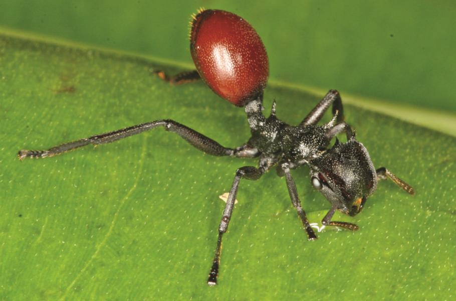 Jihoameričtí mravenci Cephalotes atratus jsou za normálních okolností zbarvení černě. Jedinci nakažení parazitickým červem Myrmeconema neotropicum připomínají dozrálou bobuli a stávají se tak kořistí ptáků, kteří parazita prostřednictvím výkalů šíří na velké vzdálenosti. (foto: AntWiki, Stephen P. Yanoviak, CC BY-SA 4.0)