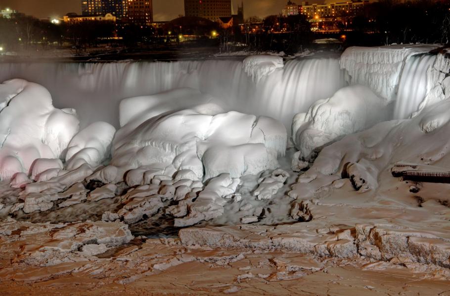 Niagarské vodopády udivují svou rozlehlostí za všech okolností. Jde o tři oddělené vodopády na stejnojmenné řece Niagara – na hranici mezi USA a Kanadou, konkrétně státem New York a provincií Ontario. V okamžiku, kdy mráz většinu toku zastaví a o další „zmrazení“ stále tekoucí vody se postará delší čas expozice, je pohled na vodopády monumentální.
