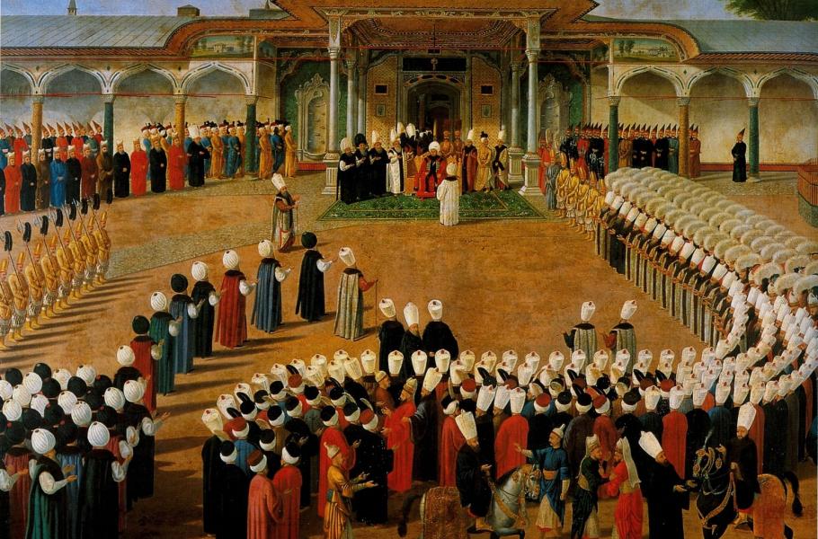 Ne že by audience zahraničních velvyslanců neprobíhaly vůbec, ale rozhodně už byly méně příjemné. Do paláce Topkapi se skutečně dostanou jen vyvolení. Kudy? Z ulice Divan Yolu nejprve projdou Branou impéria na Soudní nádvoří, kolem fontán s cypřišovým stromořadím. Nevyplatí se moc rozhlížet, protože procházejí sešikovaným zástupem mlčenlivých janičářů. Stačí jeden pohled stranou nebo zbrklý pohyb a šavle zasviští vzduchem. Pak pokračují Branou pozdravení, mramorovým dómem s vepsanými citacemi z Koránu. Na koni tudy mohl projet jedině sám sultán. I nejvyšší velvyslanec cizí země musel sesednout. A dál? Za dalším nádvořím stráženým eunuchy se nachází už jen Brána štěstí a sultánův osobní palác.