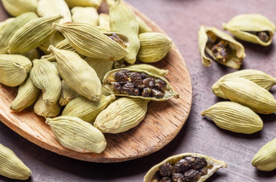 Východoasijská či indická kuchyně by nikdy nechutnala tak, jak chutná, nebýt kardamomu. Surovina se svěží, téměř citronovou vůní se přidává nejen do jídel jako „butter chicken“ čili kuře na másle nebo do koláčků, ale často se svařuje s mlékem, jež se poté doslazuje melasou či medem. Kardamom pochází z oblasti mezi Indií a Malajsií, ročně se ho na světě vyprodukuje okolo 140 tisíc tun a kilogram kvalitní sklizně se prodává přibližně za 95 dolarů. (foto: Shutterstock)