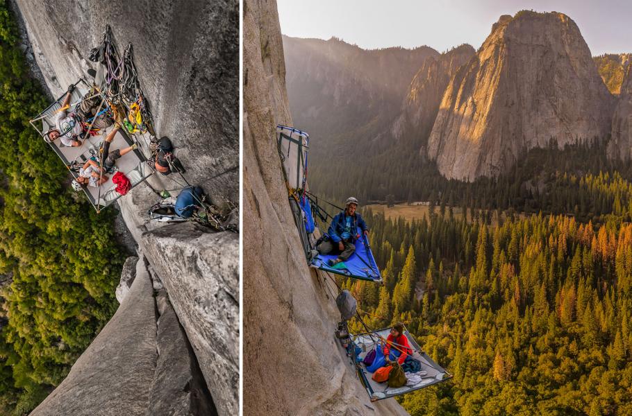 Pokud vám klasické kempování přijde nudné, možná vás osloví tato adrenalinová verze. Fotograf Alexandre Eggermont se vydal se svými přáteli do kalifornského národního parku Yosemite. Kromě šplhání po strmých srázech zdejších skal si tito odvážlivci našli čas i na zasloužený odpočinek. Podívejte se, jak takový odpočinek ve výšce několika set metrů nad zemí vypadá. Snímek byl pořízen na extrémní skalní stěně, které se říká El Capitan. Ještě ve 30. letech 20. století bylo zdolání této 900 metrů vysoké stěny považováno za nemožné.