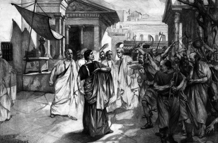 Scéna ze Shakespearova dramatu Koriolanus – hlavní postava čelí spílání svých krajanů. (ilustrace: Folger Shakespeare Library, CC BY-SA 4.0)