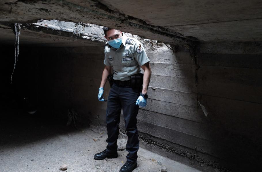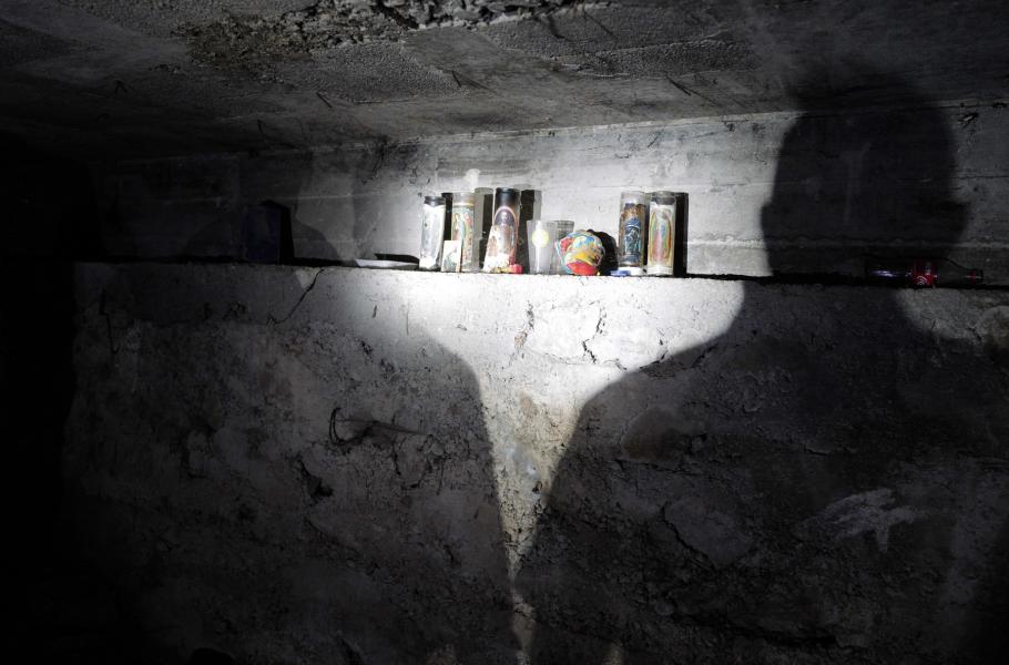 Jeden strážný právě sestoupil do kanalizace a prozkoumal boční stěnu. „Je jasné, že pracují na něčem novém,“ vysvětluje. Členové jednotky sdílejí informace jedině pod podmínkou anonymity, jinak by se i s rodinami stali okamžitě cílem kartelů. Strážný ukazuje na hromadu kamenů a zeminy poblíž improvizovaného oltáře se svíčkami, kterou někdo nedávno narušil. Trubky osvětluje pouze baterka, ze stropu kape voda a všude se šíří hnilobný zápach. „Nejtěžší je teď najít nejnovější tunel,“ líčí muž, „bude někde tady.“