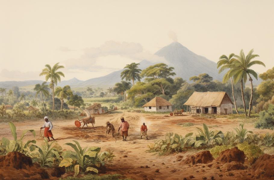 Otrocká práce na třtinových plantážích vedla v první polovině 16. století k ekonomickému rozmachu ostrova Svatý Tomáš, konec 16. století a 17. století byl naopak obdobím silného úpadku. Až do 19. století ale ostrov fungoval jako důležitý otrokářský uzel. (ilustrace: Midjourney AI, CC0)
