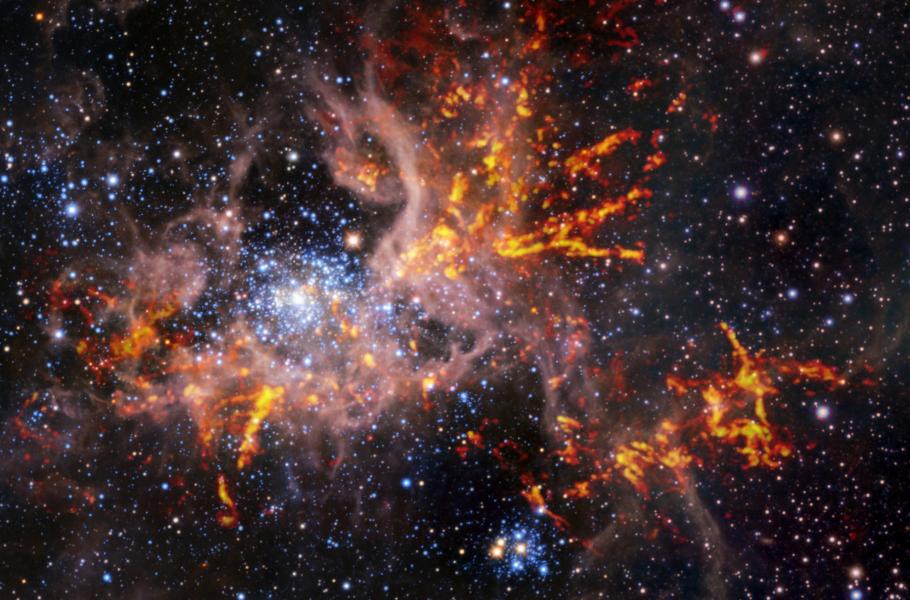 Nová pozorování získaná radioteleskopem ALMA astronomům umožnila odhalit komplexní struktury v mlhovině Tarantule – v oblasti s probíhající tvorbou hvězd známé také pod označením 30 Doradus.