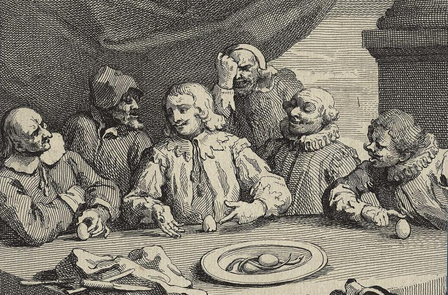 Kryštof Kolumbus s naťuklým vejcem na kresbě Williama Hogartha z roku 1752. (ilustrace: Wikimedia Commons, William Hogarth, CC0)