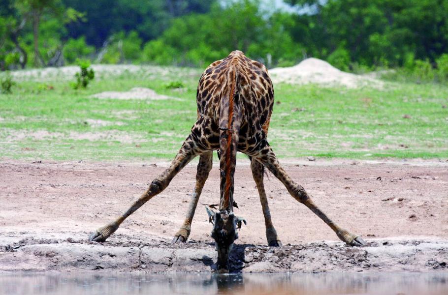 Snaha vyhnout se pití z vodních nádrží má své dobré důvody. Tento úkon je pro žirafu poměrně obtížný, musí při něm roztáhnout přední nohy, aby dosáhla na hladinu a je v této pozici velice zranitelná. Žirafu také ze stejného důvodu velice zřídka uvidíte spásat trávu. U pití i spásání je vždy velmi ostražitá, neboť jde o okamžik, kdy se může stát snadnou kořistí predátorů. V případě napadení za normálních okolností ale není zdaleka bezbranná. Brání se kopanci předníma i zadníma nohama a svými kopyty dokáže roztříštit lebku i lvovi.