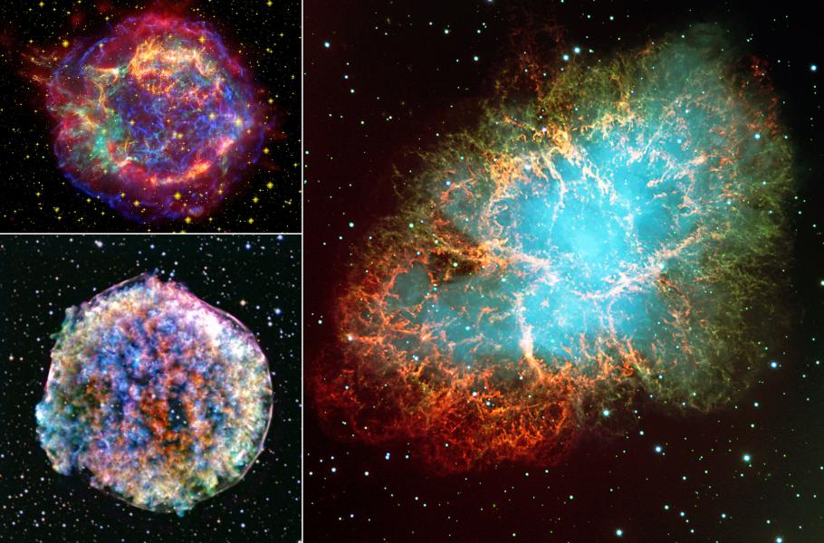 Krabí mlhovina (vpravo) představuje zřejmě nejslavnější pozůstatek supernovy (SN 1054). Její explozi zaznamenali čínští hvězdáři v roce 1054. Vlevo dole pozůstatek Tychonovy supernovy (SN 1572), jež byla jako jedna z mála viditelná pouhýma očima. Vlevo nahoře Cassiopea A, nejjasnější zbytek po supernově (v radiovém oboru). Světlo z výbuchu k nám dorazilo zřejmě před 350 lety.