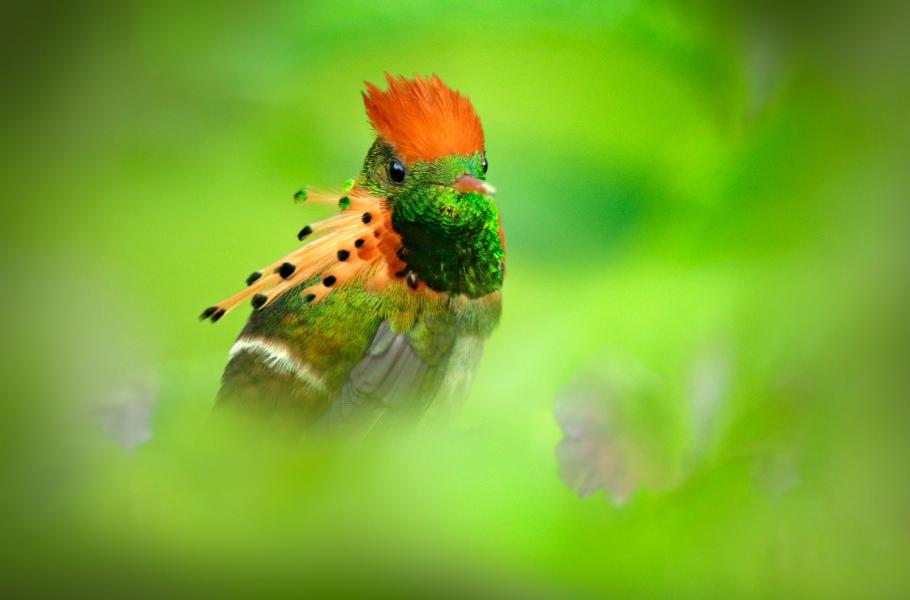 Pro kolibříka ozdobného se mezi námi rychle vžilo označení „koketek“ z anglického názvu Tufted Coquette. Tohle titěrné zvířátko dělá čest svému názvu, nafintěný je opravdu dokonale. Kolem krku má oranžový límec se zelenými tečkami na koncích, oranžovou hustou chocholku a pod krkem je zbarven perleťově zelenou. V plné kráse jej bohužel lze obdivovat pouze při čelním pohledu, jinak jsou odstíny jeho peří spíše šedohnědé.