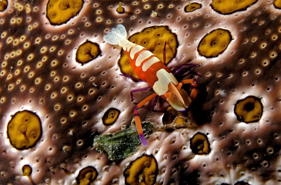 Kreveta císařská (Periclimenes imperator) do značné míry splývá se svým hostitelem, mořskou okurkou (Bohadschia ocellata). Díky tomu je na zde poměrně dobře chráněná. (foto: Wikimedia Commons, Nick Hobgood, CC BY-SA 3.0)