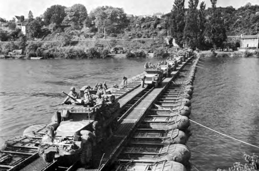 Vozidla 3. obrněné divize překračují řeku Seinu po jednom z pontonových mostů. (foto: Wikimedia Commons, PDM 1.0)
