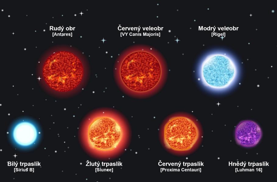 Velmi hmotné, tzv. obří hvězdy bývají skutečně fyzicky veliké a přesahují desetinásobek rozměru Slunce. Naproti tomu málo hmotné stálice označujeme jako trpaslíky, s dolní hranicí hmotnosti kolem setiny naší centrální hvězdy.