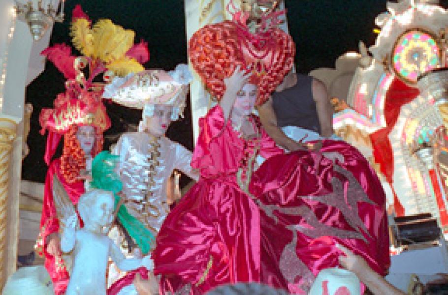 Za hodinu jsem přece jen vyslyšen a exploze utichají. Blíží se vrcholný okamžik noci, příjezd alegorických vozů, které byly odpoledne „nenápadně“ smontovány na krajích náměstí. Stavebními prvky jsou podvozek od dlouhého nákladního přívěsu, prkna, hodně škrobu s barvami na kašírované ornamenty a několikaměsíční úsilí soutěžících. Výsledkem je fantaskní kreace ve stylu, jež by měl kunsthistorik problém zařadit.