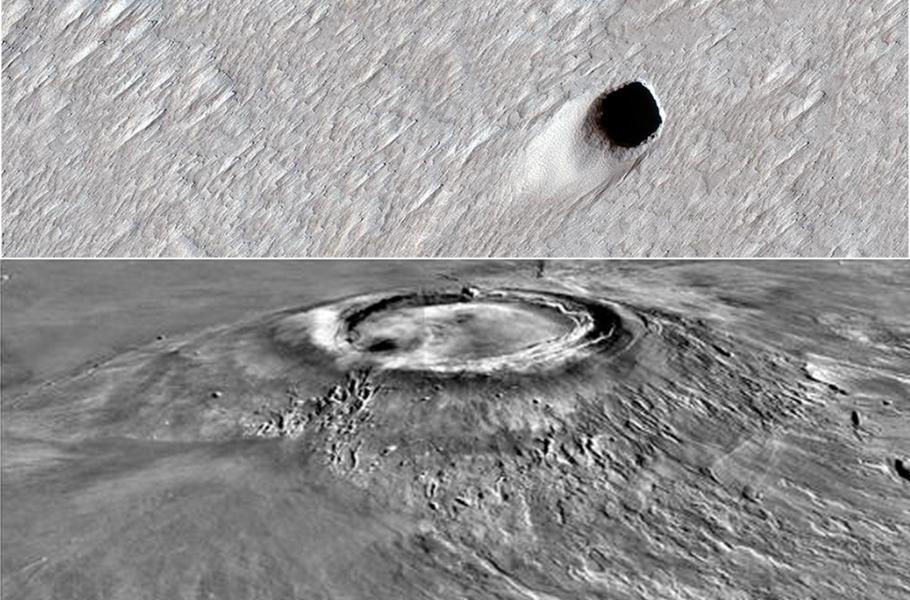 Kamera HiRISE (High-Resolution Imaging Science Experiment) na palubě amerického orbiteru Mars Reconnaissance Orbiter (MRO) nedávno vyfotila objekt, který je podle všeho prolomeným stropem lávového tunelu. S elkou pravděpodobností jde o lávový tunel, jehož rozměry dalece překračují velikost pozemských lávových tunelů.