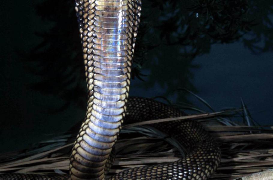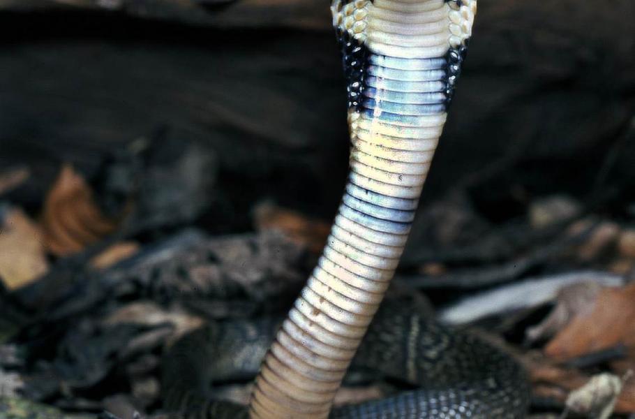 Velká královská kobra se může vztyčit až do výšky 180 centimetrů. Impozantní pohled z očí do očí by asi většině lidí způsobil šok, ale existují odvážlivci, kteří s hadem takto připraveným k útoku provádějí pozoruhodné kousky. Známé jsou polibky smrti, které v Myanmaru (Barmě) provádějí Šanské tanečnice, ale na našich cestách po této zemi jsme na ně neměli štěstí.