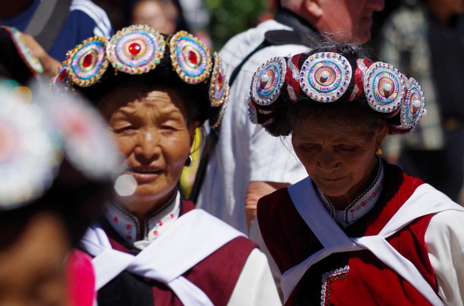Zatímco muži dnes už většinou nechodí v krojích a od ostatních obyvatel Číny byste je jen těžko rozeznávali, spousta žen své kroje neodložila. A jak to s krojem často bývá, mladé ženy dělá ještě krásnějšími, starší ženy ještě ctihodnějšími. Jednoduché vyšívané střevíce už dnes sice často nahradily obyčejné boty, ale dlouhé kalhoty, skládané sukně a vyšívané krátké kabátky zůstaly. A málem bych zapomněl na to nejdůležitější, ženy na zádech nosí prošívaný klín s kapucí. Klín je tmavé barvy, jako jasné noční nebe, na sobě má vyšitých sedm barevných kol, ze kterých vede sedm třásní, pod klínem se nachází stříbrobílá kapuce, která zevnitř připomíná měsíc v úplňku a z venku je krytá ovčí kůží. Celé se to vzadu svazuje bohatě zdobenými pásky. Většina žen dnes na hlavě nosí tmavě modrou čepici s malým kšiltem, tradiční turbany dnes můžeme vidět asi hlavně v době oslav tradičních svátků.