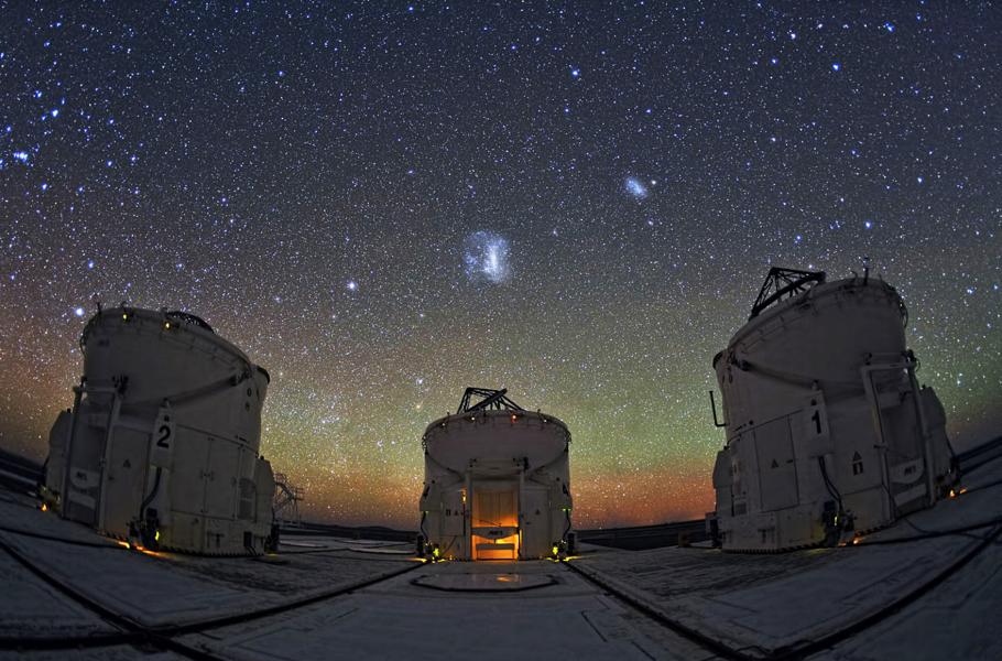 Velký a Malý Magellanův oblak nad observatoří ESO/VLT Paranal v Chile. (foto: ESO, Y. Beletsky, CC BY-SA 4.0)