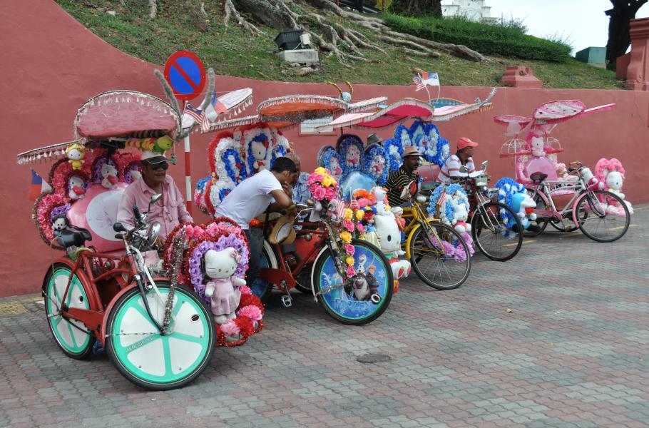 Mezi rudými budovami se sbíhají rikšové, kteří své „povozy“ barví divokými odstíny a zdobí kýčovitými postavičkami či plyšáky. Evidentně však moc dobře vědí, co dělají, protože netradiční vzhled láká turisty. Kdekdo podlehne, nechá se před bizarní rikšou vyfotit a pravděpodobně jejímu majiteli rovnou zaplatí za projížďku městem.
