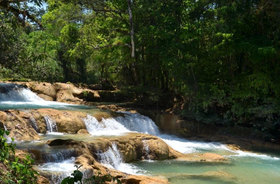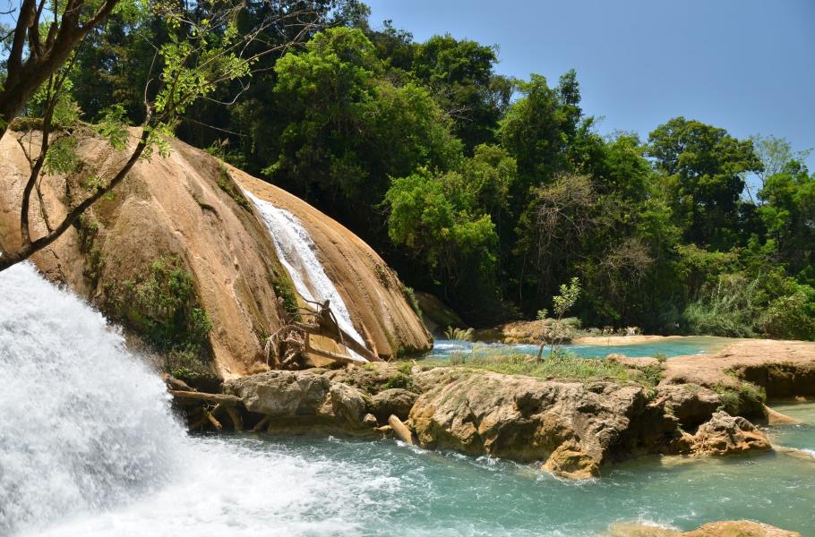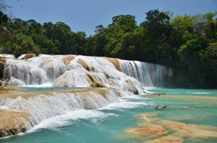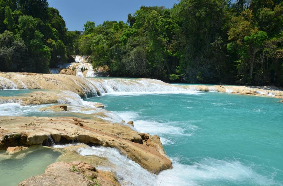 Od „parkoviště“ nedočkavě pokračuji dál. Než v krutém žáru a za stoprocentní vlhkosti dojdu k řece, není na mně nit suchá. Právě zakoupená láhev vody ve mně mizí na dva loky. Stromy se najednou rozestupují. První pohled na vodopády spolehlivě vyrazí dech každému. Řeka v barvě sytého tyrkysu vystupuje několika rameny z temně zelené hradby džungle. Vypadá to, jako by někdo výše proti proudu sypal do vody tuny porůznu naředěné tyrkysové barvy. Jméno řeky Agua Azul (Modrá řeka) je skutečně přiléhavé. Celou tu nadpozemskou krásu rámuje sytě modré nebe s konturami nadýchaných oblaků. Pohled na hranici kýče a snu.