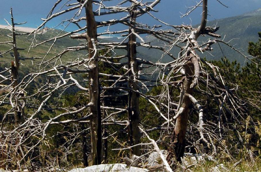 V nejvyšší části průsmyku se cesta láme zpět, teď již k Jónskému pobřeží. Nejvyšší autem dostupný bod je i křižovatkou, ze které se rozbíhají dvě trasy pro trekking. Jedna směrem k menšímu hřebenu, jehož dominantou jsou vysílače. Tato strana je z hlediska pěší turistiky nenáročná. Druhá pěšina ovšem míří přímo k nejvyššímu hřebenu a zejména díky strmému terénu, velkému převýšení a velmi neurčitému značení trasy, je dost problematická.