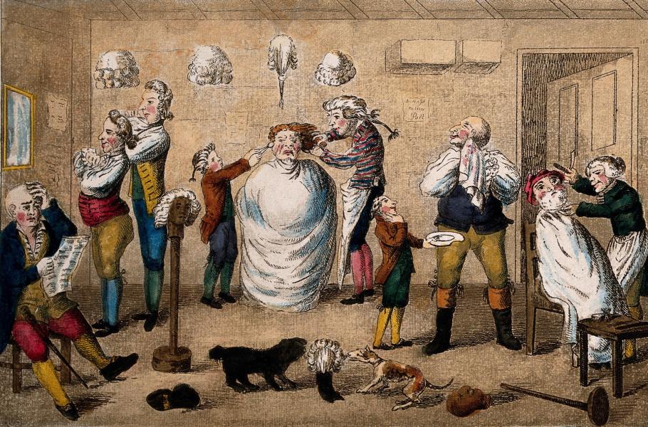Paruky a honosné oblečení byly znakem společenského postavení. (ilustrace: Wellcome Collection, W.H. Bunbury, PDM 1.0)