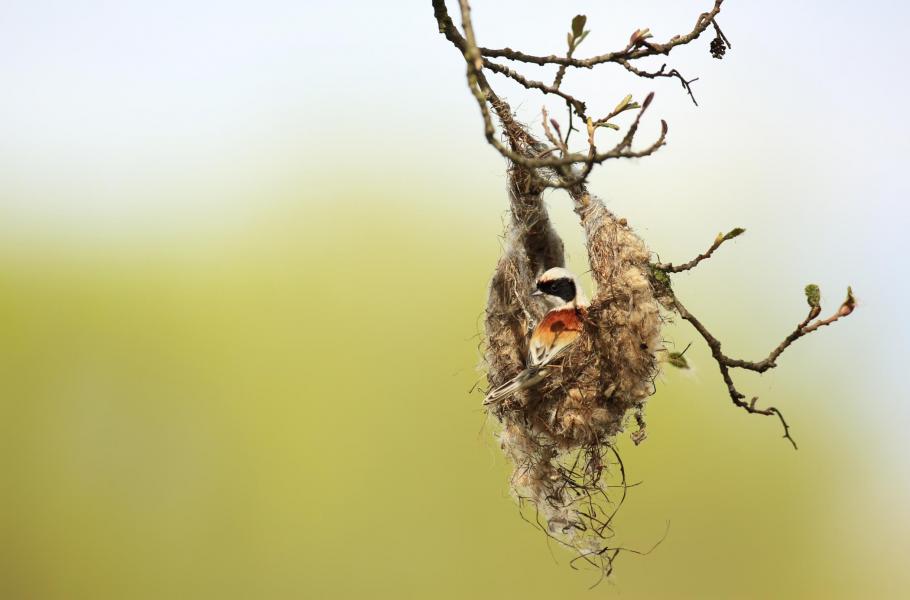 Aby ale zaujal samičku, nestačí mu pouze hvízdání. Musí jí nabídnout základy společného budoucího „domku“. Na vhodných místech položí, přesněji řečeno zaplete, základy pro svoje budoucí hnízdo, kteréžto umění ho tolik proslavilo. Nejprve si vyhlédne vhodnou větévku, nejčastěji na bříze nebo vrbě. Na výšce mu tolik nezáleží. Na některá hnízda dosáhnete ze země, některá jsou téměř 30 metrů vysoko. Někdy může být okolo vhodné větvičky opravdový frmol a mohou si ji nárokovat i dva hnízdění chtivé páry. Jsou známy i případy, kdy na téže větvičce bylo hnízdo postaveno i ve dvou letech po sobě.