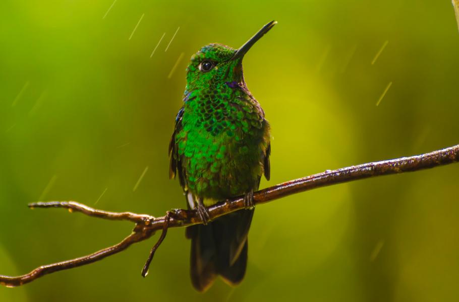 Okolo mě kmitá chvíli modrá, chvíli zelená, hnědá nebo bílá a jejich rozličné kombinace. Pozoruji míhající se kolibříky a říkám si, že dnes musí při letu určitě vydávat ještě víc energie než jindy, protože silný vítr proniká i přes hustou spleť větví. Závany zmítají nejen drobnými těly poletujících opeřenců, ale i mohutnými větvemi tropických stromů, jež jsou porostlé množstvím bromélií. Jemné kapky deště, který doprovází větrné počasí, ulpívají na objektivu a znemožňují pořídit ostrou fotku.