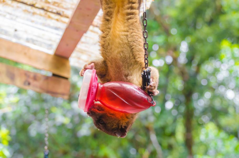 Jenže zvířátko má úplně jiné úmysly. Postupuje systematicky od jednoho krmítka k druhému. Každé naklání a líže vytékající cukrovou vodu, zatímco kolibříci poplašeně poletují okolo. Sladký nápoj mizí v tlamičce olinga a na rozblácené zemi a během chvilky jsou všechna krmítka prázdná. Jako by olinga tlačil čas a bál se, že přijde správce parku a odežene ho od snadného zdroje potravy.