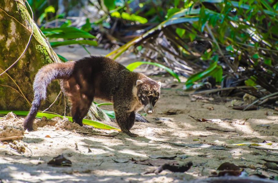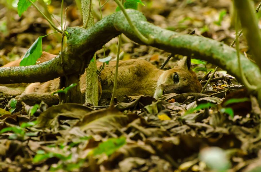 Stezka ke stanici uprostřed parku se vine jen několik málo metrů od hranice mezi pralesem a pláží, kde se intenzivní zvuky cikád mísí s pravidelným vlnobitím Pacifiku. Tady leží pod hustými větvemi pralesa hnědá puma (Puma concolor), která dokonale splývá s okolním listím. Šelmu prozrazuje snad jen odlesk obrovských očí, které bedlivě sledují naše pohyby. Puma odpočívá u zbytků těla zřejmě nedávno uloveného nosála a přítomnost lidí ji nijak netrápí.