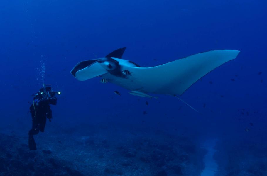 Omlazovací proces je pro mne skvělou příležitostí k focení. Manta je v klidu a většinou se nenechá rušit. Snažím se ani nedýchat, abych ji neplašil vypouštěnými bublinami. Jakmile ale začnu modrat a vydechnu, rejnok sebou trhne. Pak už záleží jen na něm, zda bude mou přítomnost s klidem ignorovat, nebo raději zmizí do bezpečí.