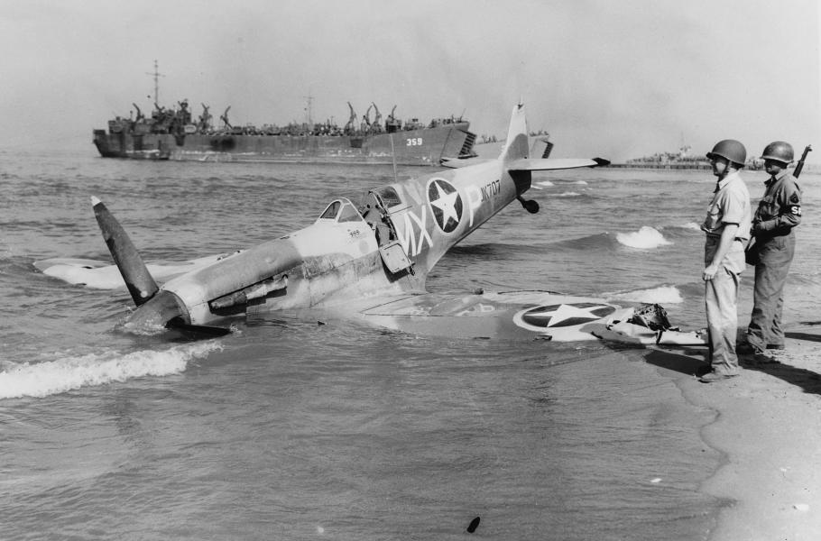 Spitfire poručíka Prybyla na pláži u italského Salerna. V pozadí americká výsadková loď USS LST 359. (foto: Wikimedia Commons, U.S. Navy PDM 1.0)