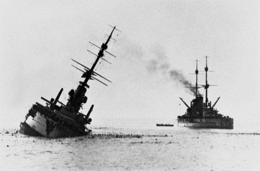 Szent István krátce předtím, než klesl ke dnu. V pozadí sesterský Tegetthoff. (foto: Wikimedia Commons, NHHC, CC0)