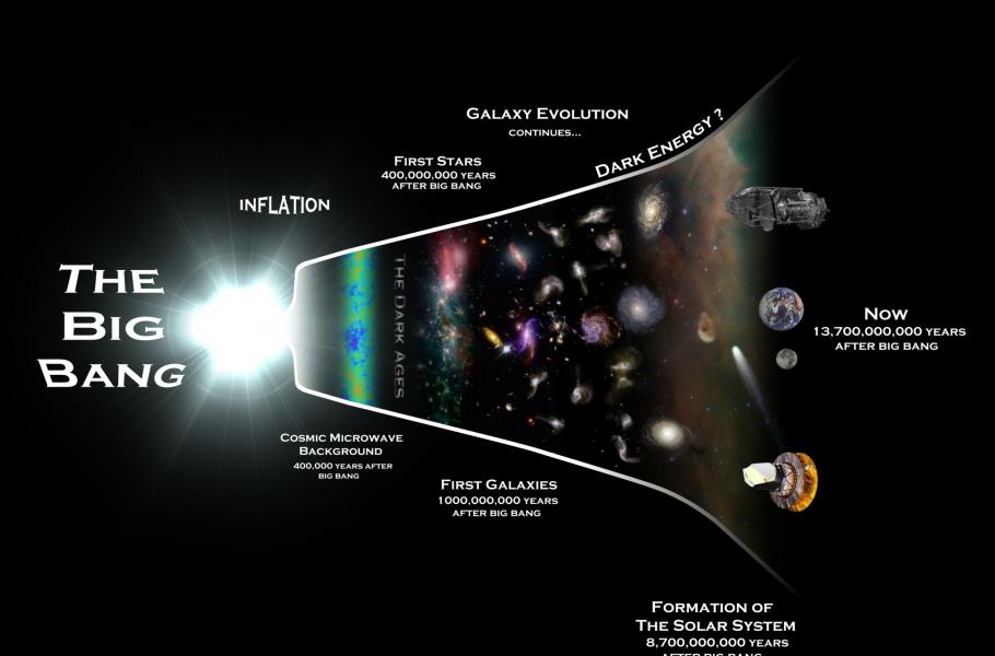 Z Einsteinových rovnic vyplývalo, že vesmír nemůže být statický, že se musí rozpínat. A i když tomu zpočátku vědci příliš nevěřili a snažili se (zejména Einstein) rovnice upravit tak, aby statický, neměnný kosmos připouštěly, experimentální fakta zjištěná o několik let později hovořila jasně: vesmír není statický, opravdu se rozpíná. Lze tedy soudit, že kdysi – ve velmi vzdálené minulosti – musel být daleko menší, a že dokonce v určitém okamžiku byla veškerá současná hmota vesmíru napěchována do nepředstavitelně malého, až nulového objemu. Zmíněný okamžik dnes nazýváme Velký třesk (termín původně posměšně použil britský astronom Fred Hoyle, který s danou teorií nesouhlasil).