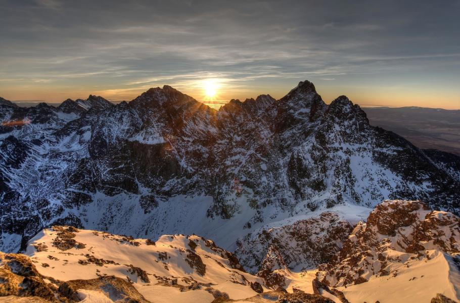 Východ slunce nad Rysy. Název hory pochází z polštiny, kde „rysa” znamená „čára”. Důvodem je výrazný, dlouhodobě vysněžený, žlab pod vrcholem, viditelný z polské strany. (foto: Wikimedia Commons, Maciej Kraus, CC BY 2.0)