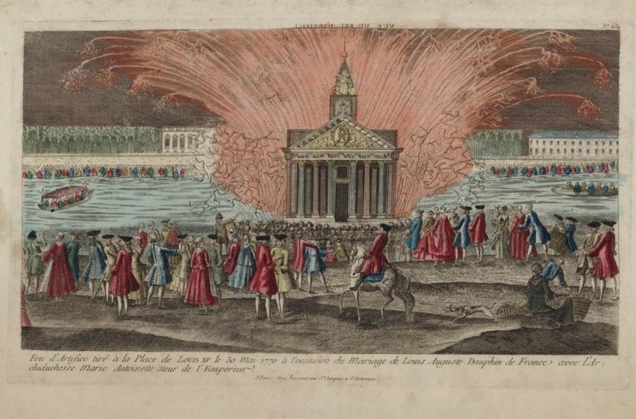 Když nebe nad Paříží v roce 1770 rozzářil ohňostroj, došlo k šílené panice. V nastalé tlačenici přišly o život stovky lidí. (ilustrace: Bibliothèque nationale de France, CC0)