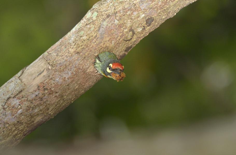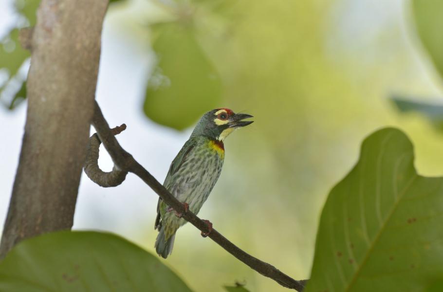 Vousák zvučnohlasý (Megalaima haemacephala)