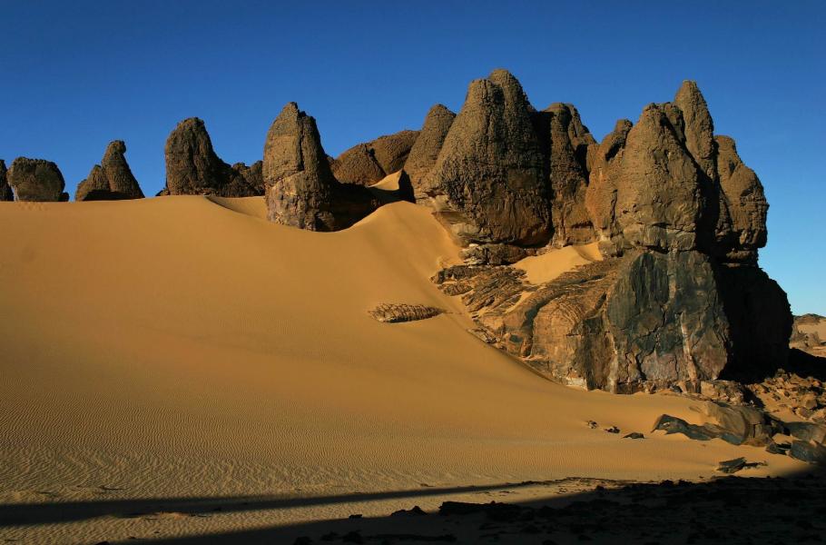 Pohoří Ahaggar, známé též pod názvem Hoggar, se nachází v centrální Sahaře na úrovni obratníku Raka. Tato oblast jižního Alžírska je převážně tvořena skalnatou a písečnou pouští, která, jak je vidět i na tomto snímku, může působit velmi malebně. Zdejší průměrná nadmořská výška je více než 900 metrů a nejvyšší vrchol Mount Tahal je dokonce 3 003 metrů vysoký. Z toho důvodu zde mohou noční zimní teploty spadnout pod bod mrazu.