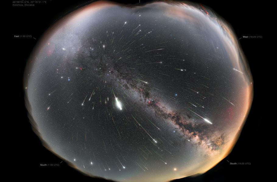 Snímek Petra Horálka zachycuje mozaiku Perseid z louky vedle Kolonické hvězdárny na východě Slovenska. Při bližším pohledu zjistíte, že to není úplně obyčejná mozaika, neboť není tzv. celooblohová, nýbrž celonoční. Jde totiž o mozaiku od soumraku do úsvitu (soumrak i úsvit jsou vidět v horních částech vlevo a vpravo, na ranní obloze vlevo doplněny ještě o zodiakální světlo). Když si prohlédnete světové strany, zjistíte, že jih je tam dvakrát – zastoupen momentem začátku fotografické noci a momentem jejího konce.