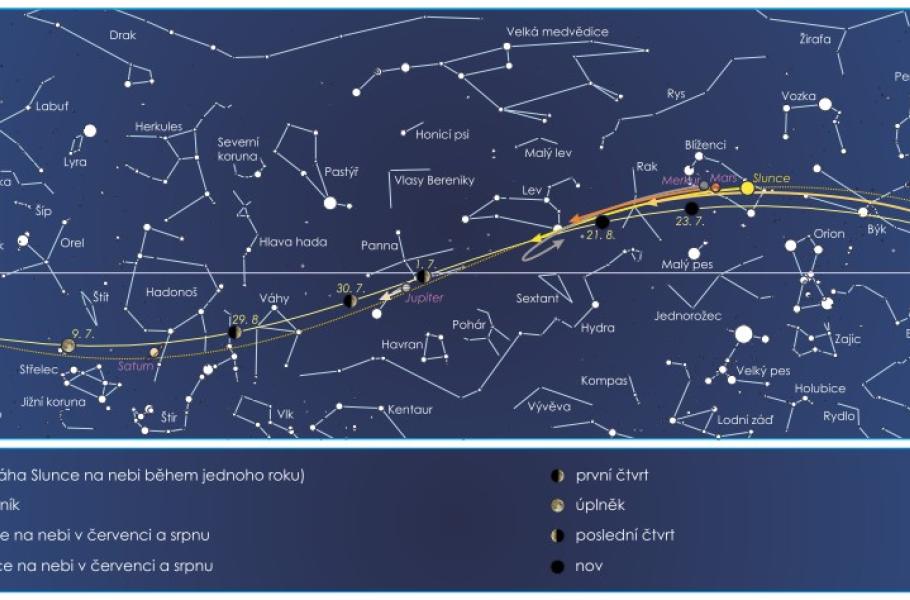 Zatímco první z nich bude nebe okupovat pouze pár hodin po západu Slunce, Saturn se zdrží podstatně déle. V červenci bude pozorovatelný téměř po celou noc kromě rána. Zapomenout bychom neměli ani na velmi jasnou Venuši, která jako Jitřenka opanuje ranní oblohu nad východem. Do blízkosti výše uvedených těles se navíc v průběhu prázdnin sem tam dostane i Měsíc (viz přehled zajímavých úkazů).