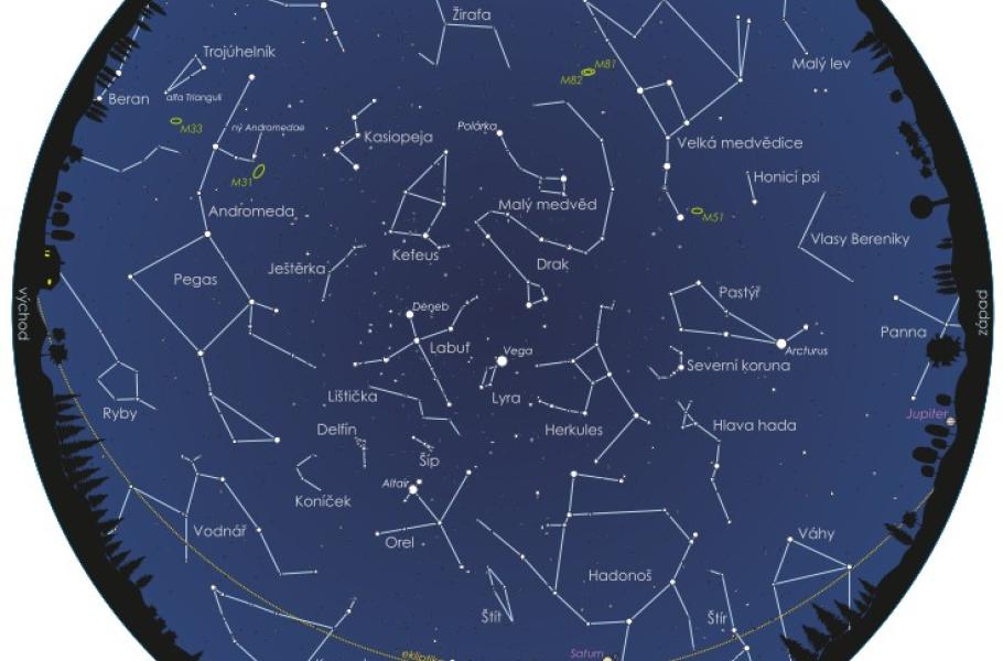 Kterou hvězdu zahlédneme na letním soumrakovém nebi jako první? Naoranžovělý Arcturus ze souhvězdí Pastýře? Nebo snad modrobílou Vegu z Lyry? Či nažloutlou Capellu z Vozky? Stejně tak je ovšem možné, že to bude některá z nápadných planet. Po celé prázdniny budou na podvečerní obloze zářit hned dvě: Jasnější žlutobílý Jupiter nalezneme v souhvězdí Panny nízko nad jihozápadním obzorem, zatímco nažloutlý Saturn objevíme v područí Hadonoše nad jihem.