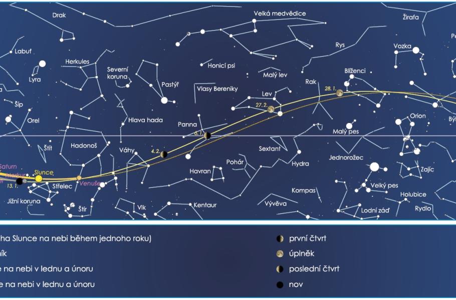 A co zbývající dvě planety viditelné pouhýma očima? Zářivá Venuše, dosahující −3,9 mag, bude pozorovatelná jen na počátku ledna na ranní obloze nad jihovýchodem v souhvězdí Hadonoše. S Marsem a jeho 0 mag zavládne o poznání lepší situace. Během ledna a února se přesune z Ryb přes Berana do Býka, a bude tudíž dohledatelný v první polovině noci nad jihem až západem.