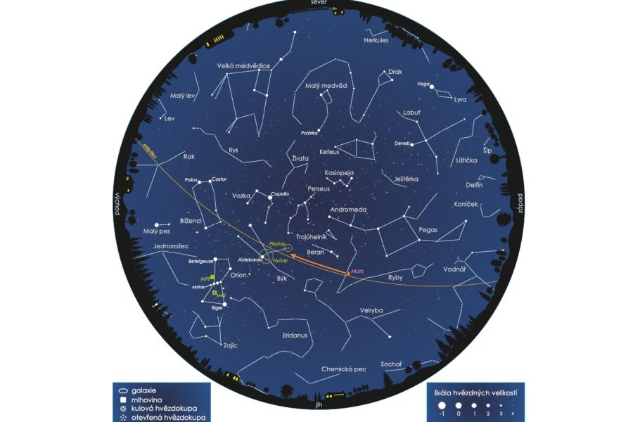 V témže čase a ve stejné části nebe spatříme i nejkrásnější zimní souhvězdí – Orion s jasnými stálicemi Betelgeuze a Rigel. A také se známou Velkou mlhovinou v Orionu, alias M42 či NGC 1976, pod Orionovým pásem složeným z trojice dalších výrazných hvězd.