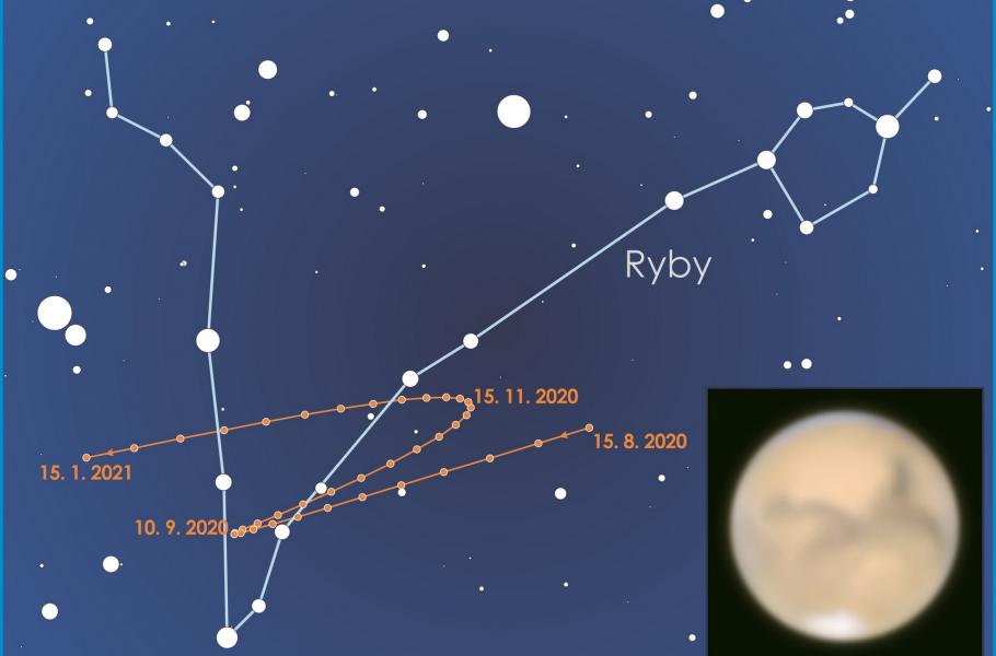 Zůstaňme však zatím u popisu našeho souseda při pohledu pouhýma očima. Na hvězdném nebi ho letos v říjnu zastihnete v souhvězdí Ryb a určitě jej nepřehlédnete: Jeho jasnost se totiž vyšplhá až na −2,6 mag, čímž asi třikrát překoná nejjasnější stálici noční oblohy Sirius. Zanedbatelný ovšem nebude ani úhlový průměr kotoučku planety, jenž dosáhne 22,6″. Pro srovnání: Zmíněná hodnota může při pohledu ze Země kolísat v rozmezí 3,5″–25,1″ a úměrně s ní samozřejmě roste i klesá množství detailů viditelných v dalekohledu.
